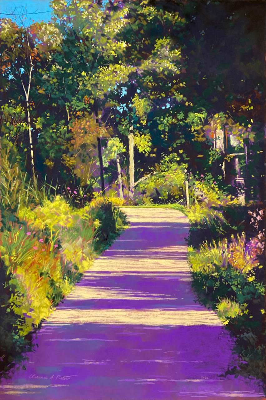 Clarence Porter’s luminous pastels capture pathways, neighbourhood streets, and familiar roadways with remarkable sensitivity to light. His compositions guide the viewer gently forward: down a shaded garden walk, across a sunlit suburban corner, into spaces where colour and shadow quietly shift. The pathway becomes both subject and metaphor — an invitation into reflection and the quiet poetry of everyday surroundings.
